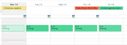 My Google calendar contains a block from 8-9 every weekday morning labeled "writing," just as it has had since last September. I intend to keep it that way. Sticking closely my daily writing regimen has propelled me through more than 30,000 words of my new novel in about six months. There's a nice utilitarian, workaday feel to blocking out time for being creative.