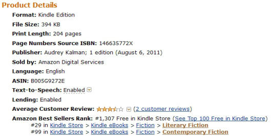 More exciting—though really just in a personal thrill kind of way, since this doesn't have much impact on anything—is the fact that Dance of Souls spent time in positive Amazon ranking territory as a result. Early in the offering, halfway through day one, it ranked #18 in Literary Fiction and #59 in Contemporary Fiction. It rose (sank?) steadily until late today, the first moment I thought to take a screen shot, it stood at #29 and #99.