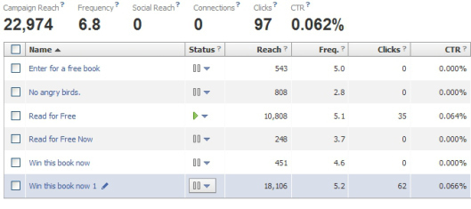 I also found that offering something for free through a Facebook ad, when targeted to the right people, does result in clicks. Notice the "Read it for Free" and "Win this book now" ads below, which resulted in respectable click-through rates. (As suggested by Facebook, I created multiple ads, monitored performance closely, and paused the ads that seemed not to be doing as well.)