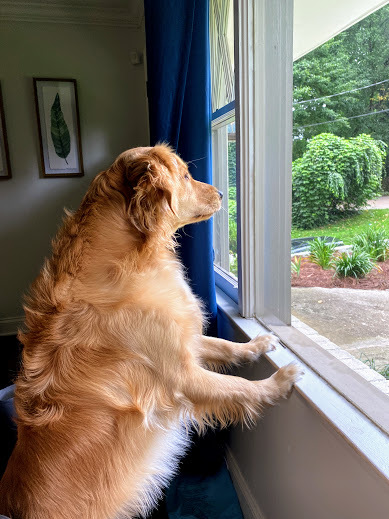 My son’s golden retriever Libby came to stay with us recently. Ian’s Atlanta home was on the market and needed to be free of dog hair for a couple of weeks. Libby has visited us plenty of times but never for an extended stay. For the first day or two she was curious about everything, sniffing around the house and yard, and watching through windows as cars and people passed by our house. But by the end of day two, she was more protective of her new territory. Somehow, she had decided that people walking in the street were a threat, and the cars stopped at the stop-sign and idling across the road needed to move on. The dog whose idea of dealing with a stranger was once a wag of the tail and a gentle “woof” on their approach followed by licking them into submission, has become a serious guard dog.