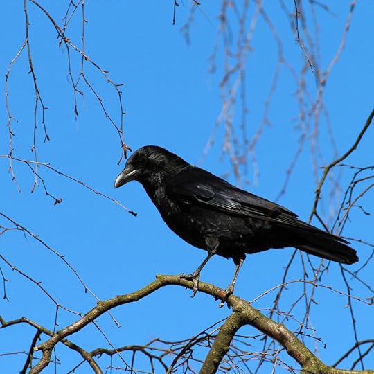 That crow splashing around while he takes a bath in my back yard is so large, he fills the birdbath and splashes most of the water out of the bowl. When he takes off in the late afternoon sun, the water glistens on his black feathers and it sprays off of his flapping wings until he lands in a nearby tree. As I walk out with the garden hose and refill the birdbath with fresh water, I wonder if he is sizing me up and memorizing my appearance. I gaze up at the crow and give him a good look at my face. It can’t hurt to be on the good side of an animal whose group is called a murder and who is known to mob his enemies. Besides, since there are no primates around, he is probably the second smartest animal in the neighborhood—which probably isn’t saying much.