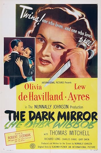 Love that tag line! Olivia DeHavilland plays a double role as good and evil twins in this twisty psychological thriller. A doctor is murdered and one of the twins is suspected, but no one can tell them apart so there's no way to prove which one did it. A doctor who specializes in twins agrees to study the two women and see if he can use science and psychology to determine which one is the killer. Of course the good twin falls for the doc and you don't have to have a PhD to see where this is headed.