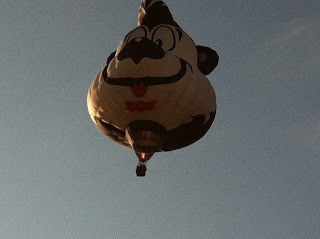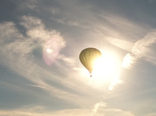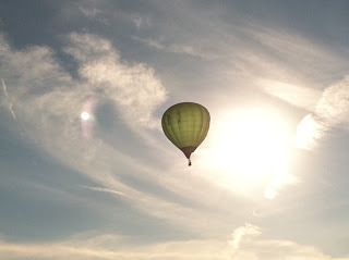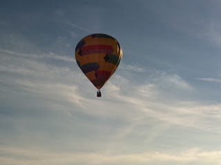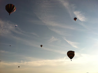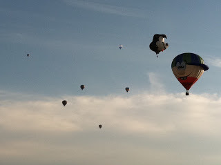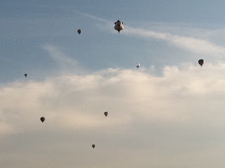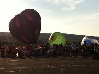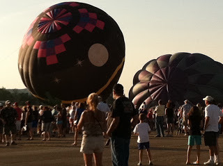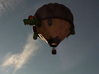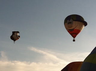 Approximately two dozen balloons were on the ground, ready to fill and billow into the sky. Some never made it off the ground, and sadly, my favorite - a purple dinosaur balloon - was in that category. Balloons filled, tottered for fifteen minutes, then collapsed. Others filled and simply rose. In the end, almost twenty balloons filled the sky - all at once!