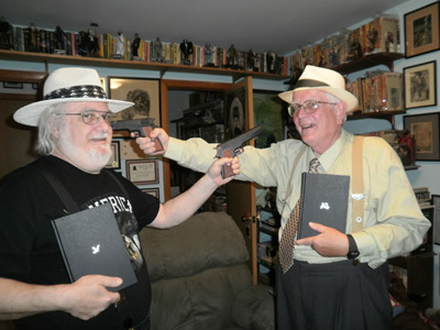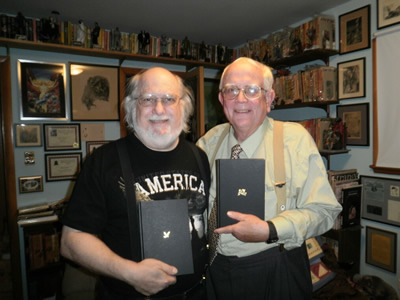 Bob: I've been lucky enough to meet a lot of old timers in the SF/Fantasy fields, both writers and artists. I think meeting Edd Cartier, one of the great artists from the 1940's, had to be one of my greatest thrills. I corresponded for several years with Dean Cartier, Edd's son about his father's work, but had never met him as I was living in Chicago and he was in New Jersey. Then I flew out to Jersey for a collector's convention and it was not too far from the Cartier home. Dean invited me over to visit. I talked for several hours with his father and got to see several hundred original Cartier illos done for the 1940's pulps. It was an exciting day! Fortunately I was wise enough to bring a camera with me and I took some great photos of Cartier and his art for my scrapbook.