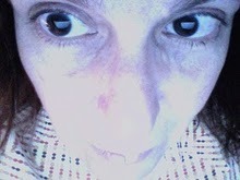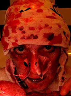As an aside, note the strange orange hair. When camera lights hit my reddish hair, it looks as if my head's going up in flames. While you can't tell from the video, the director coated my face in heavy white powder.