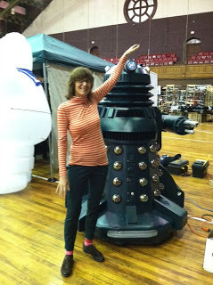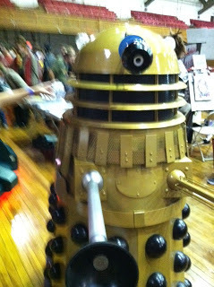 Thanks to the Rochester Fantasy Fans (in particular, the fantastic Wayne Brown), two Daleks roamed the Armory all weekend, threatening to "Exterminate!" everyone in sight. I was almost Exterminated at least twice. (If I happened to be wearing an evening dress - not that I own such a garment - you might think I'm giving away a Dalek prize in the above left photo.)