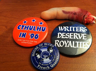 In the 90s, writers were into buttons and often passed them out at conventions. Most of these buttons were along the lines of "I'm an Author, please feed my creditors" and "Writers deserve royalties." I collected quite a few and tossed them all into the Trivia Box back home.