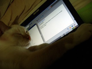 I'm trying to finish proofing Hemovore for the print edition and I'm doing it on my EEE, and "someone" (aka Frankie) has decided he really really likes that computer. So I can't get on it now without him insinuating himself in there and hoarding it. So I started reading a book, figuring he'd then turn his attention to the book for a while, but no. There he is clinging to the EEE as if there's cat porn or sports on it.