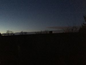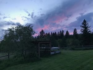 I haven’t, in point of fact, finished the work in progress, but I think, I think, I’m closing in on a draft. I just had three days’ worth of writing retreat at the lovely place wherein I saw the sunset in the photo to the right.