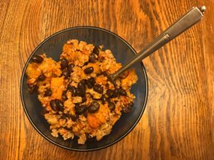 Then I dumped the roasted sweet potatoes and squash in with the ground turkey, drained & added a can of black beans, stirred it all together and called it good. It would probably be even better if you roasted fresh vegetables instead of using frozen, and presoaked and cooked the black beans instead of using canned. But that would be more effort and sometimes more effort is not going to happen.