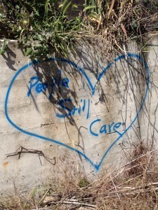 (Image is a blue heart shape spray-painted on a concrete wall, with the phrase ‘People Still Care’ spray-painted inside.)