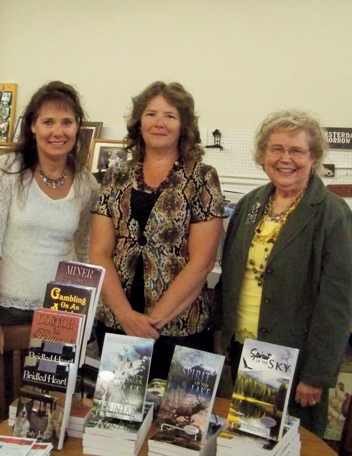 writers, Carmen Peone (far left) and Paty Jager (center) at a booksigning for And Books Too! in