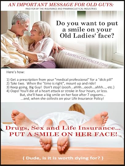 Every 3rd commercial you see on TV is for “dick pills”, or Life Insurance. I’ve often wondered if all this expensive advertising is a conspiracy between women, the pharmaceutical industry and life insurance companies to cash in on sex as a way to boost sales. Also, it’s a smart and legal way to get rid of the Old Man, and live happily ever after collecting on the Life Insurance policy when the old f*cker is dead, long, long after menopause and the total cessation of sexual desire. By the way, my own father died of a heart attack at the age of 78 while having sex with my mother. (true story.)