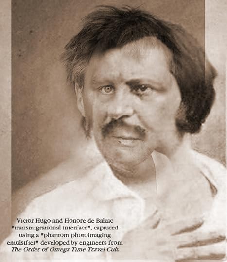 Helen deMurier, Secretary of the Paris, France Chapter of the Order of Omega Time Travel Cult, was recently dispatched on an assignment to investigate the apparent merging of the French writer Honor de Balzac in a rare philosophical convergence with another famous French author, his friend, Victor Hugo. The above image was recorded of when the two disembodies spirits of these men apparently “merged” during a rare “transmigrational interface” which was recorded by a device developed by The Omega Time Travel Cult engineering department. The engineers were able to capture this unique event at the instant of it’s occurrance using a new invention they named the “phantom photoimaging emulsifier”.