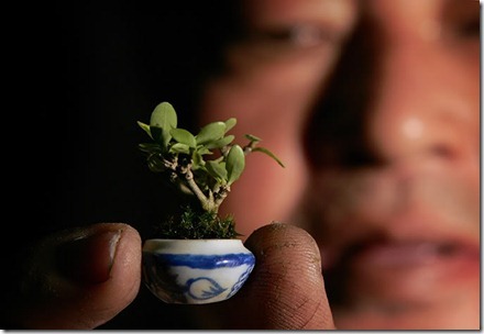 Bonsai literally means “plant in a tray” in Japanese and it seams that the tree and the pot form an unique harmonious unit where the shape, texture and colour of one, compliments the other. To obtain a harmonious bonsai can take dozens of years of pruning, wiring, leaf trimming, clamping and grafting. Some of the specimens featured here are faithful to the Japanese aesthetics and philosophy, while some growers made a real effort to get out of the box…arr, tray.1. World’s Smallest Bonsai TreeWhat’s smaller than a miniature tree? A miniature miniature tree. This masterpiece measures 22mm and it was obtained from a Malaysian local species called “water jasmine” – the only species that can apparently be made so small. Creator Kuah Tee Teong claims that it may be the world’s smallest bonsai, since the standard measure of a miniature bonsai is 10cm. Kuah doesn’t strive for popularity and didn’t register his creation in the Worlds Book of records, neither is he planning to sell his tiny trees. His philosophy: ‘’If I sell, then I’ll have nothing to show.” He also prunes animal shaped trees that look like dogs, snails or octopuses.