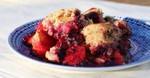 Sift the dry ingredients for the topping into a small bowl and cut in the margarine. Fold in the egg or egg sub and add enough almond milk to hold the dough together. Knead gently. Divide the dough into 8 portions rolling each into a ball and then flatten each one into a disc. Overlap the dough patties around the outside edges of the fruit.