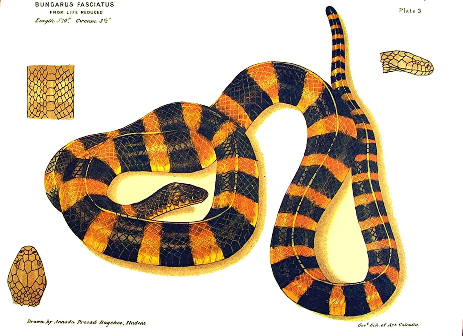 The banded krait Bungarus fasciatus as depicted in Joseph Ewart's book The Poisonous Snakes of India (1878) (public domain)Most other krait species also exhibit striping, albeit of different degrees of vividness. Needless to say, however, any mention of such markings in Kipling's description of Karait is conspicuous only by its absence, which would be highly unusual for Kipling if he had indeed intended Karait to be a krait, because his knowledge and descriptions of other Indian fauna was always very skilled. True, a few krait species do not possess stripes, but these still tend to have a very bold background body colour, such as shiny brown, glossy black, or even deep blue with a bright red head in one species (B. flaviceps from southeast Asia), so once again they differ substantially from the nondescript appearance ascribed by Kipling to Karait.