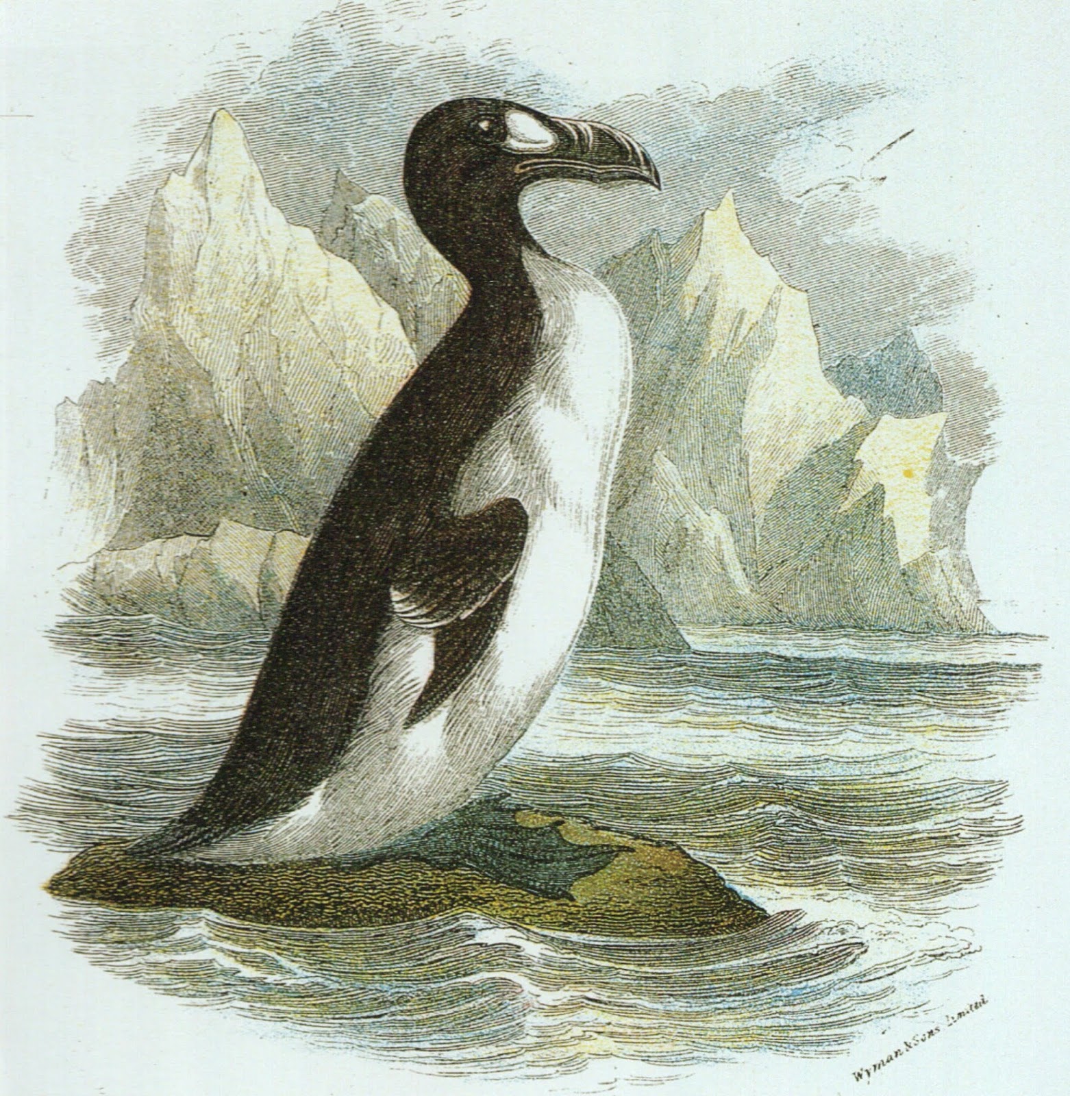 As fondly commemorated above in Charles Kingsley's classic children's novel The Water-Babies: A Fairy-Tale For a Land-Baby (1863), one of the most famous extinct species of modern-day bird is the great auk Pinguinus impennis, also known as the garefowl, gairfowl, or geirfugl. Almost 3 ft tall (the only taller auk was the prehistoric Howard's Lucas auk Miomancalla howardi), this sturdy flightless black-and-white seabird from the northern hemisphere was superficially reminiscent of the southern hemisphere’s familiar penguins, but its link with them does not end there – because the great auk was the original penguin, the latter name having been initially bestowed upon this puffin-allied species. Only later was it applied by those European sailors first penetrating Antarctic waters to the wholly-unrelated birds that they encountered there and which retain it today, long after the original northern penguin’s extermination.