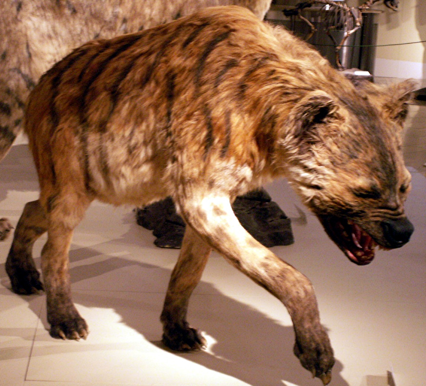 I totally agree with Bill that Ron’s mystery beast certainly recalls Loren’s shunka warak’in – but if such a beast does indeed exist, what could it be? The most conservative notion is that reports of it feature nothing more than freak/deformed wolves or odd feral mongrel dogs. Even the stuffed specimen, sloping back notwithstanding, appears more canine than hyaenine in overall form as depicted in the photo of it. Additionally, an escaped/released genuine hyaena or two may also have been sighted. However, with the exception of the very dark-furred but also very rare brown hyaena Hyaena brunnea, modern-day hyaenas are generally light-coloured with distinctive spots or stripes (depending upon the species).