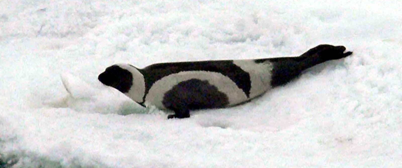 The ribbon or banded seal – an absolutely unmistakeable species (public domain)Instead, it was from an exceptionally beautiful, exquisitely marked species of phocid (earless) seal – namely, Histriophoca fasciata, the ribbon or banded seal. Up to 5 ft long, it is native to the Arctic and subarctic regions of the northern Pacific Ocean, but especially the Bering Sea…separating Russia from Alaska! Moreover, it is immediately distinguished from all other seal species (and all other species of any kind of mammal, for that matter) by virtue of the two very large white circles on its body (one on each side) and also the two wide white bands encircling its neck and tail respectively that collectively decorate very strikingly its otherwise uniformly dark-brown or black pelage.