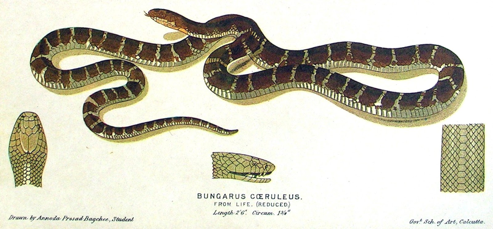 )Naturally, the name 'Karait' instantly calls to mind the very similar name 'krait', applied both colloquially and scientifically to a number of species of venomous elapid snake native to India and elsewhere in Asia, and belonging to the genus Bungarus – which is why as a child I had simply assumed from his name that Karait had indeed merely been a krait. However, my fascination with Kipling's diminutive yet deadly dust serpent increased during subsequent years, in tandem with my burgeoning ophidian knowledge, when I realised that what little morphological and behavioural information concerning Karait had been given by Kipling did not accord with any krait species (either in its adult or in its juvenile form) that was known to exist anywhere within or even beyond the Indian Subcontinent.
