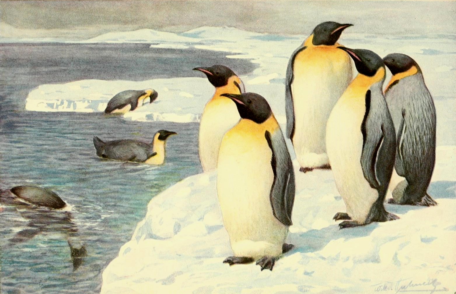 King penguins in a delightful illustration from 1910 (public domain)Nevertheless there are a number of more promising reports of post-1844 survival too. Indeed, a sighting of a single living specimen on the Grand Banks of Newfoundland in December 1852, made by eminent field naturalist and ornithologist Colonel Henry Maurice Drummond-Hay with the aid of binoculars, and at a distance of only 30 yards or so away while he was traveling aboard a steamer, has lately been formally accepted by the IUCN (International Union for Conservation of Nature and Natural Resources). It was first brought to mainstream attention in 1979 by T.R. Halliday in a paper on the great auk published by the periodical Oceans. Moreover, in 1853 a dead great auk was supposedly found on the shore of Trinity Bay on Newfoundland's eastern side, and three years later another one was reputedly caught on its western shore, but neither specimen was submitted to scientists for confirmation (or otherwise).