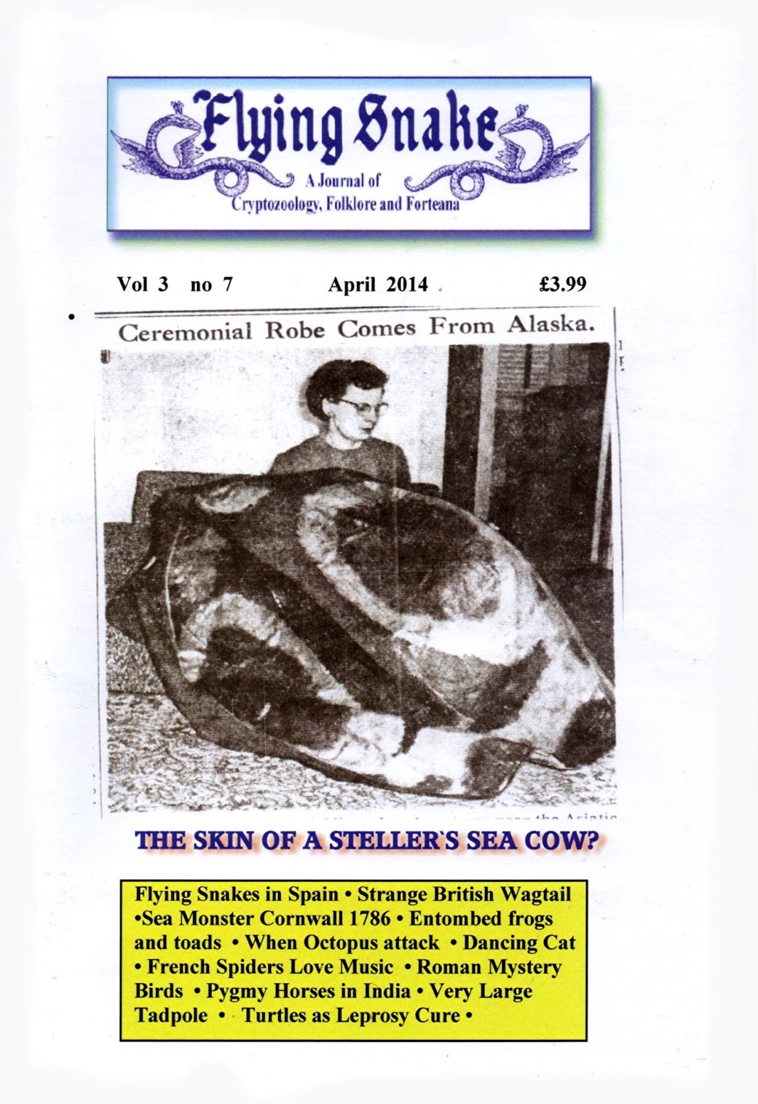 It all began with a local newspaper article. On 6 April 1956, the Kansas City Star in the U.S.A. published the photograph that appears on the above-reproduced front cover of Flying Snake for April 2014, together with the following details. The person holding the torso skin, and pictured with it in her East Tenth Street, Intercity District, Kansas home's living room, was Mrs Faye Keyton, who had inherited it jointly with her brother, W.L. Shafer, from their aunt, Miss Myrtle Shafer, who had died in May 1955. It was normally kept rolled up inside a long cardboard tube, was quite stiff, and according to Mrs Keyton it was an Alaskan Indian burial robe that had been made from the skin of a Steller's sea-cow. But how did she know this?