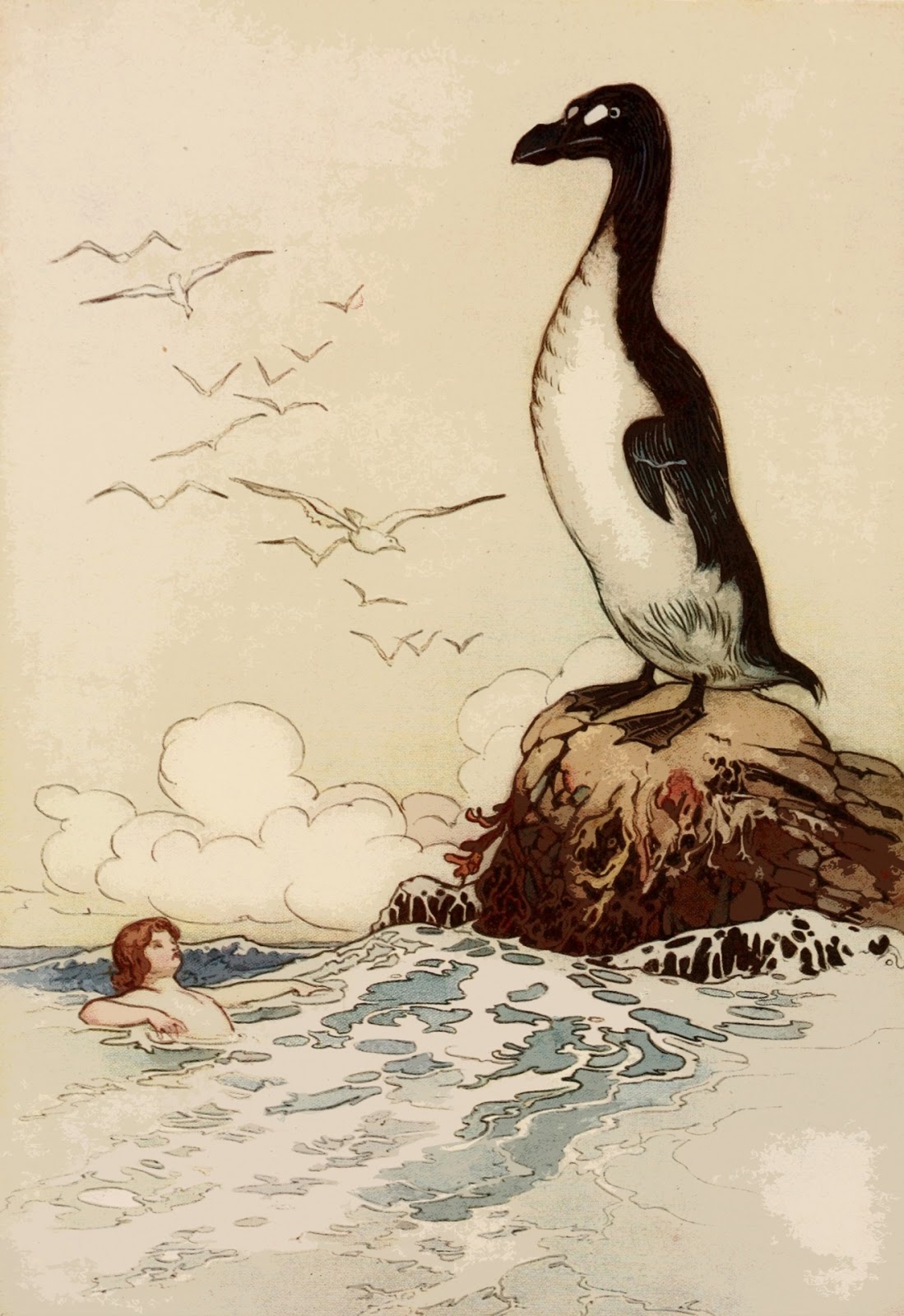 Tom the water-baby meeting the last of the great auks or garefowl – an exquisite painting by Warwick Goble for an illustrated 1909 edition of Charles Kingsley's The Water-Babies, which is one of my all-time favourite children's novels (public domain)And there he saw the last of the Gairfowl, standing up on the Allalonestone, all alone. And a very grand old lady she was, full three feet high, and bolt upright, like some old Highland chieftainess. She had on a black velvet gown, and a white pinner and apron, and a very high bridge to her nose (which is a sure mark of high breeding), and a large pair of white spectacles on it, which made her look rather odd: but it was the ancient fashion of her house.