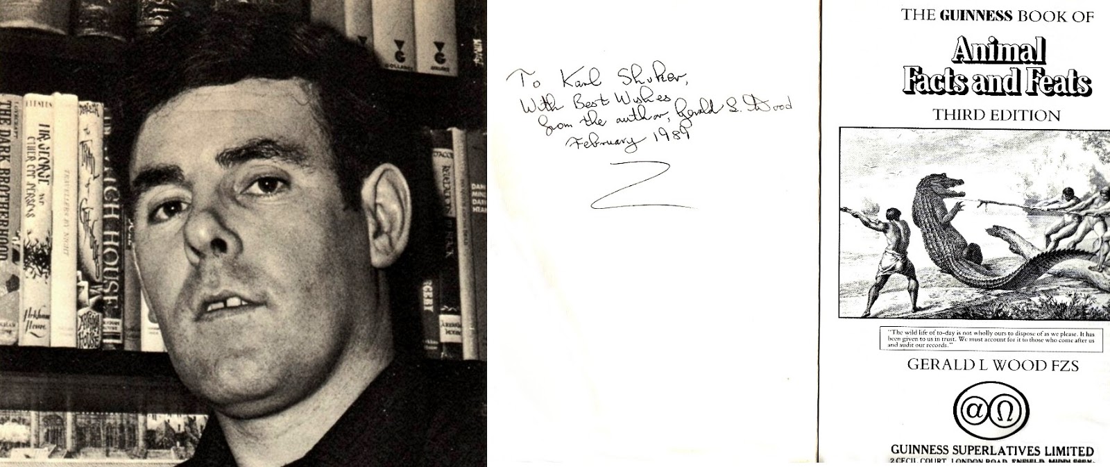 Gerald L. Wood, one of my earliest cryptozoological/animal superlative correspondents and friends (© Gerald L. Wood), and my much-treasured signed copy of his Guinness Book of Animal Facts and Feats, 3rd edition (© Gerald L. Wood/Guinness Publishing/Dr Karl Shuker)This ShukerNature blog article is expanded and updated from the original section contained within my book From Flying Toads To Snakes With Wings: From the Pages of Fate Magazine.