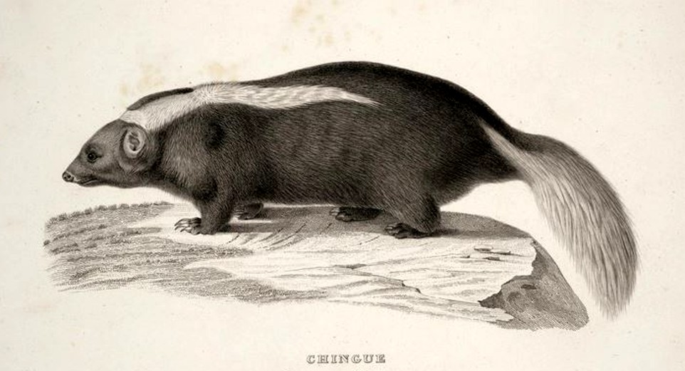 An engraving from 1848 depicting the Andean hog-nosed skunk (public domain)Skunks, of which there are at least ten recognised species, were traditionally classed as mustelids (members of the weasel family), but more recently, based upon genetic studies, these infamously malodorous mammals have been allocated a taxonomic family of their own. However, although they do exhibit quite a diversity of morphologies, none of them has a pouch – a taxonomically-significant anatomical feature specific to marsupials. Moreover, only the hog-nosed skunks (genus Conepatus, constituting 4-5 species, depending upon opinion) are native to South America, and only two of these species are known to occur in Argentina – the Andean C. chinga in some of this vast country's northern regions, and the Patagonian C. humboldtii throughout much of its southern portion.