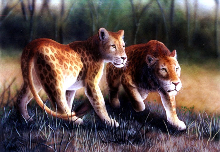 Painting of a pair of marozis or Kenyan spotted lions, based upon a preserved skin and eyewitness descriptions (© William M. Rebsamen)Tropical Africa's native tribes frequently classify animals by way of criteria very different from those used by scientists. Often an individual animal that is of a colour or size different from that of normal specimens of the same species, or an individual that is notably more aggressive than others of its own species, is given an entirely separate name by the natives and thought of as being of a form totally different from the more typical members of its species. Therefore it is certainly possible that, despite the Kikuyus' firm denial, the damasia really is just a dark-coloured (pseudo-melanistic?) leopard.