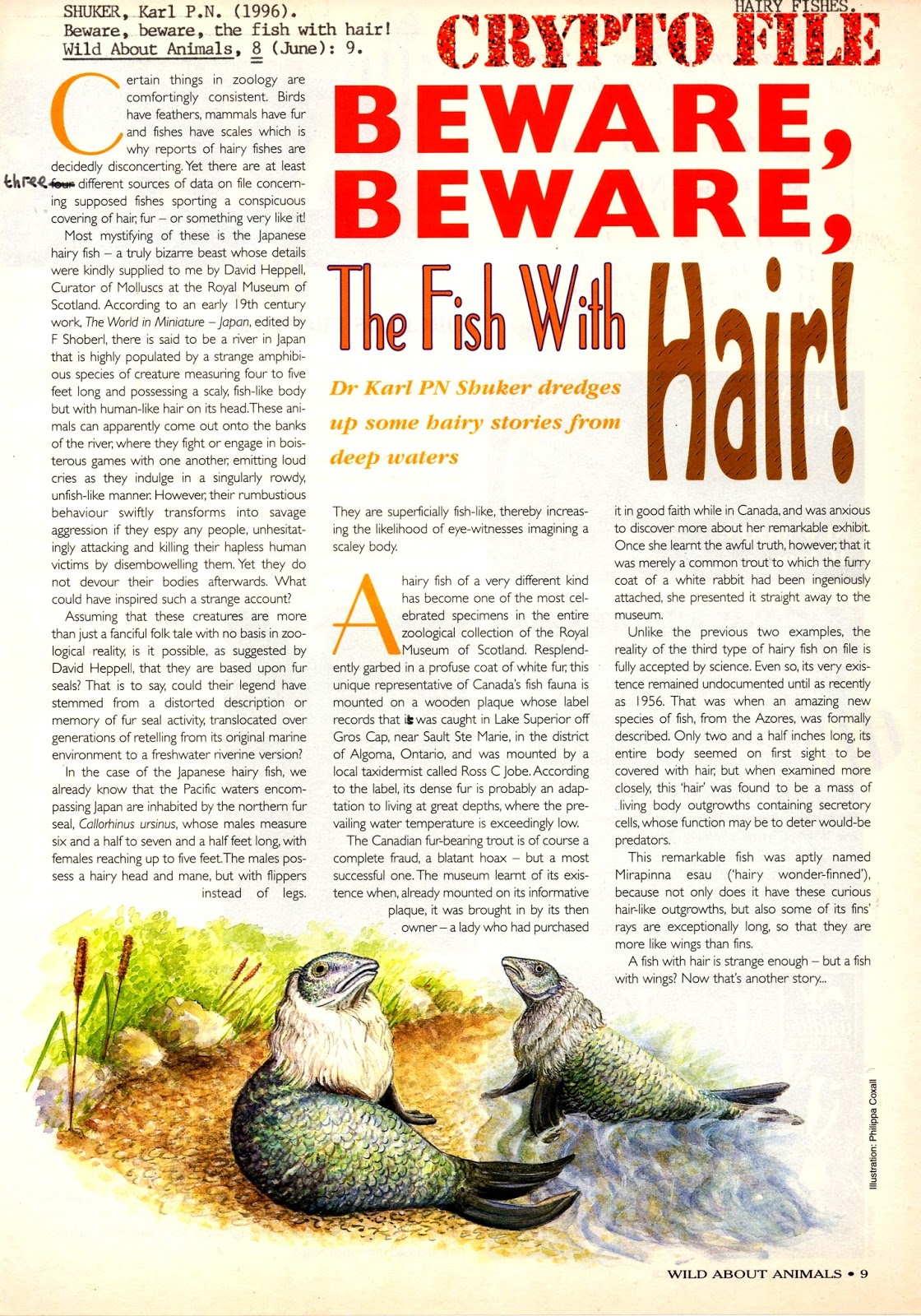 My June 1996 Wild About Animals article re 'fish with hair' - please click image to enlarge for viewing and reading purposes (© Dr Karl Shuker)NB - Please note that these early articles of mine are being reproduced here for their historical interest; their content may be outdated in places. Updates and additional examples of furry fishes can be found in my 2003 book The Beasts That Hide From Man . Also, please click here for an even more recent, updated ShukerNature account concerning the true nature and taxonomic identity of Mirapinna esau.