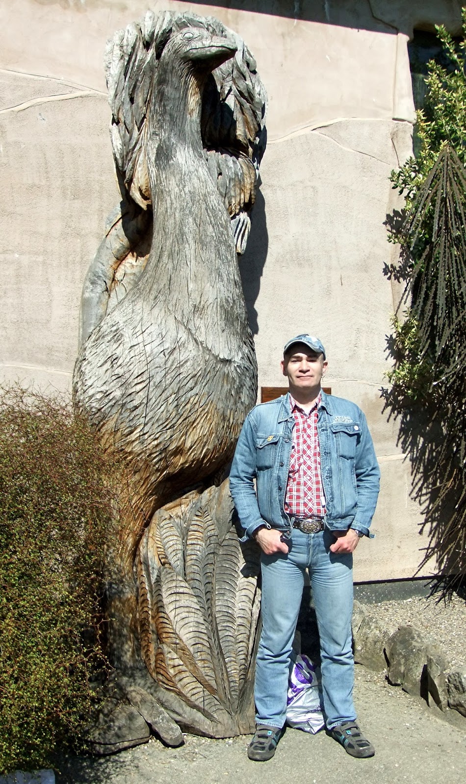Alongside a life-sized statue carved in 2004 by Frank Triggs of the giant moa Dinornis at Chester Zoo, England, in 2013 (© Dr Karl Shuker)