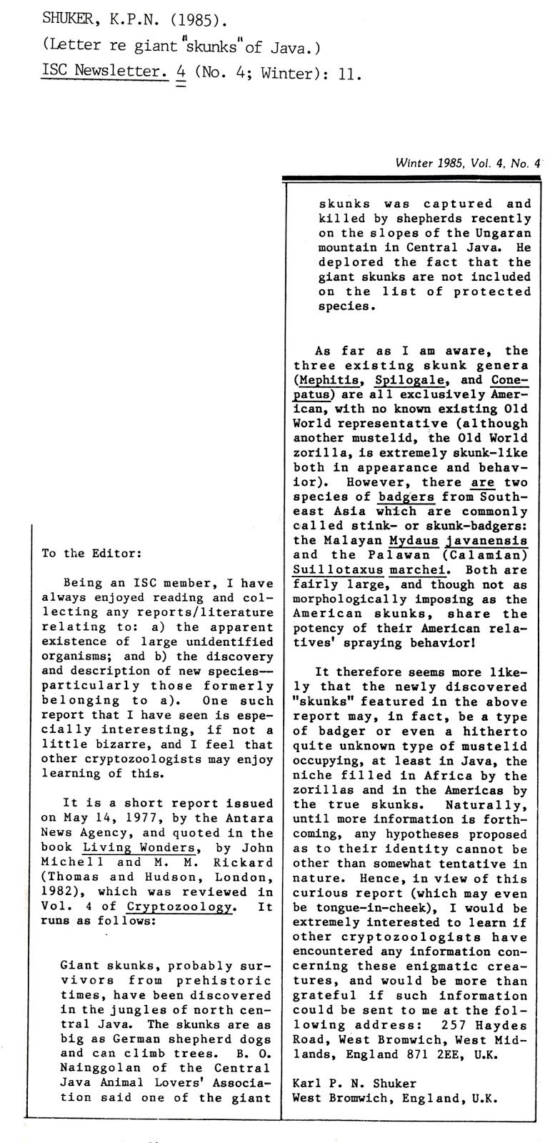 Skunks, of course, are not the size of alsatians, they do not inhabit Indonesia or anywhere else in the Old World per se (but see the end of this blog article for a pertinent taxonomic tail-note), and they are not typically arboreal. Consequently, in an attempt to find out more regarding these Javan anomalies, I penned a letter of enquiry to the ISC Newsletter – the now-defunct International Society of Cryptozoology's quarterly newsletter – which was duly published in its winter 1985 issue. And here it is: