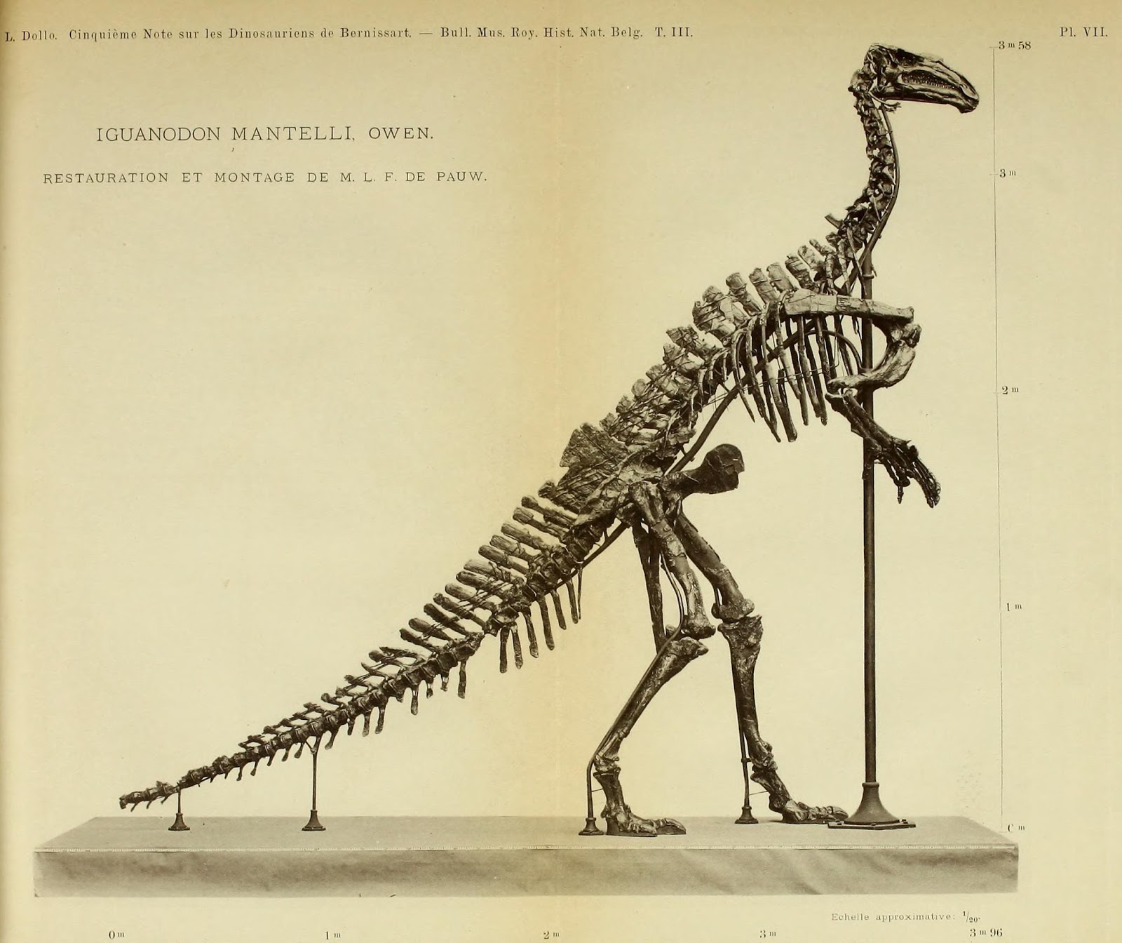 Vintage illustration of a Bernissart Iguanodon skeleton assembled in upright stance (public domain)True, the skeleton cast's upright, rearing stance is now deemed to be incorrect (modern-day palaeontological belief holds that Iguanodonadopted a more horizontal stance), but back then this was how science assumed that this very sizeable dinosaur form stood in life, and explains why the archway's Iguanodoncarving is also depicted in upright stance (note too the dragonesque series of dorsal triangular spines running down the carving's back – another now-rejected morphological feature). Moreover, being directly inspired by this cast, the museum's logo has always been an upright bipedal Iguanodon as well (it would be too costly and troublesome to change it now, especially as the logo is so well known).