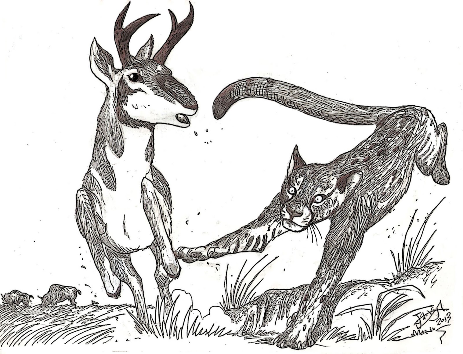 Artistic representation of a Truman's cheetah attacking a pronghorn (© Hodari Nundu)Two rather more conservative identities remain. The onza may simply be a mutant form of the puma, the result of a genetic aberration that has yielded an uncommonly slim, leggy variety. Its gracility is, indisputably, a natural facet of its appearance (rather than starvation-induced emaciation), because the Rodriguez specimen was found to possess adequate amounts of body fat. If not a genetic freak, the onza could be a separate subspecies of puma, kept apart from the Mexican puma Puma concolor azteca by behavioural differences and dissimilar habitat preferences. If the last-mentioned identity were the correct one, however, then once again (as with the possibility that it is a separate species) we would expect the onza to be distinguishable biochemically and genetically from other pumas. But is it?