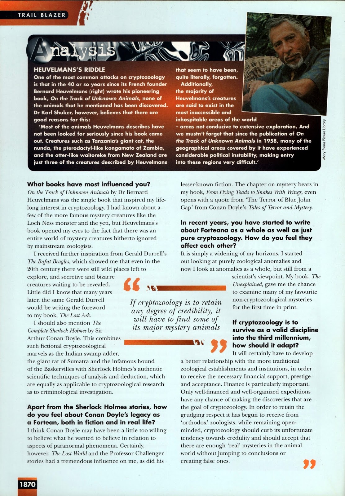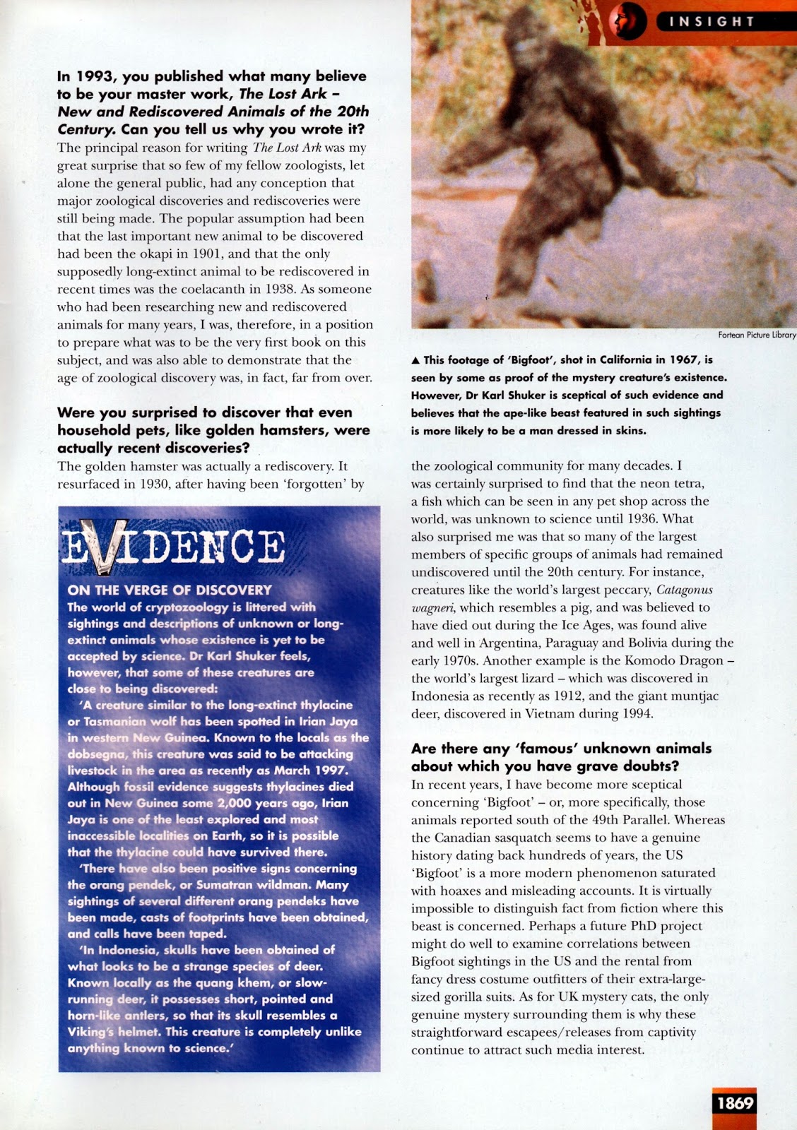 )Moving from one side of the Atlantic to the other, I also learned in 1997 from Scottish-born zoo keeper Alan Pringle that one of his colleagues, education officer Jon Flynn at Cricket St Thomas Wildlife Park in Somerset, was convinced that several years previously, he too had seen a photograph of de Loys's ape that included some men standing on either side of it. Unfortunately, however, he could not recall any details of the publication containing this picture.