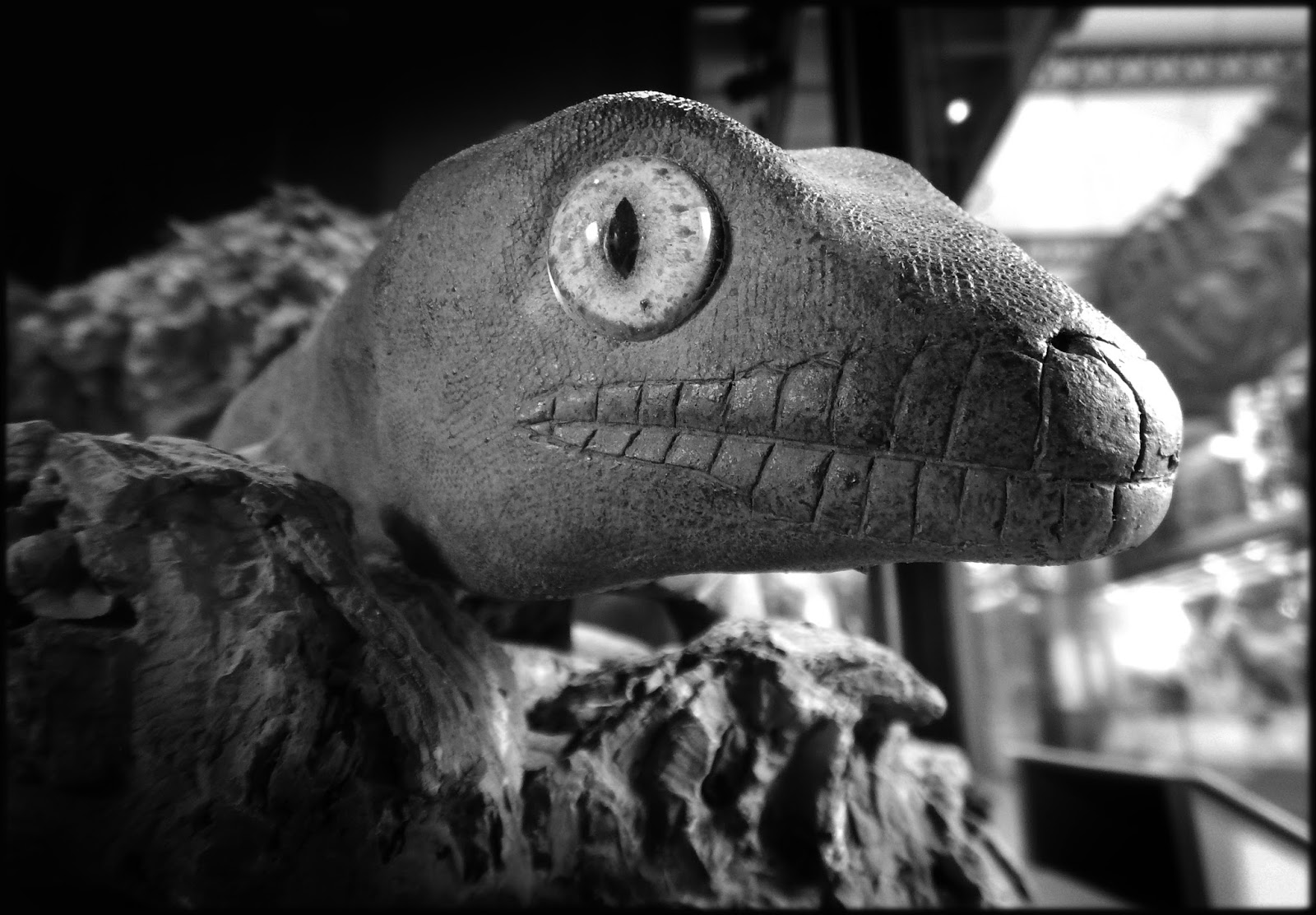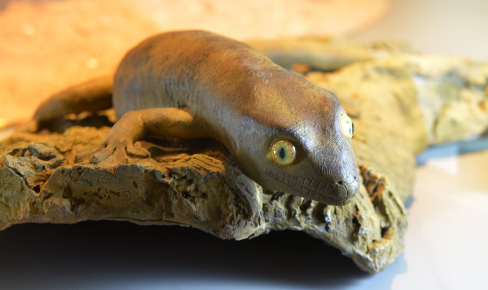 Front view of the model of Delcourt's giant gecko featuring in the exhibition 'The Dear Departed' that was presented in 2000 by Lille Natural History Museum(© Lamiot-Wikipedia -