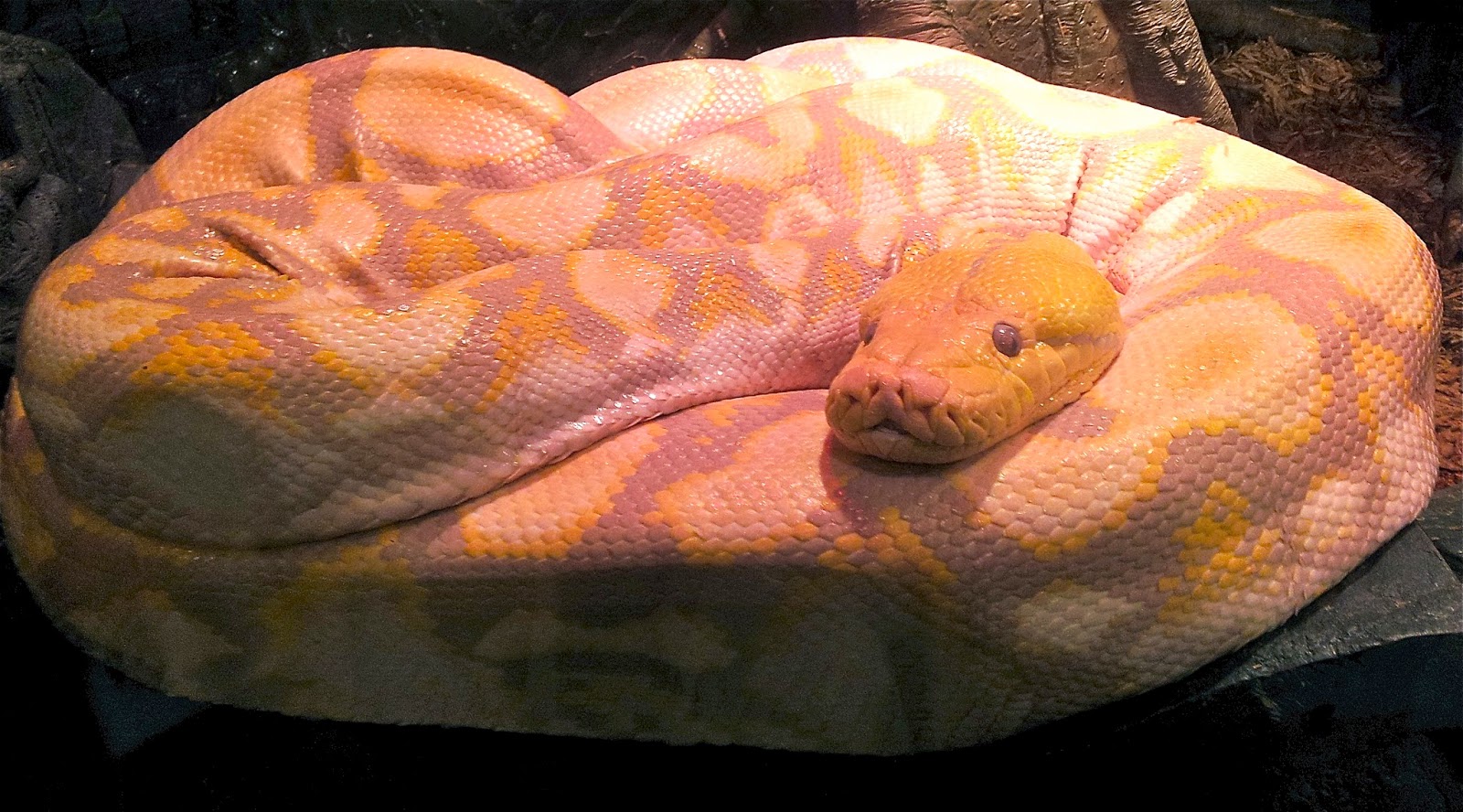(Above) A genuine photograph of a wild-type reticulated python (public domain); (Below) A genuine photograph of Lemondrop, a lavender albino reticulated python housed at the California Academy of Sciences in Golden Gate Park, San Francisco, California, USA (© Maya Visvanathan/Wikipedia –