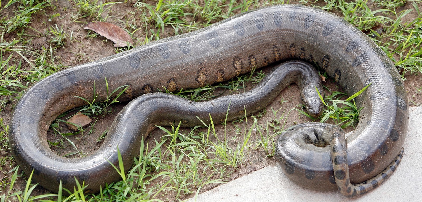 A genuine photograph of the green anaconda Eunectes murinus– the largest and most familiar of the four species of anaconda currently recognised by science (© Wagnermeier/Wikipedia –