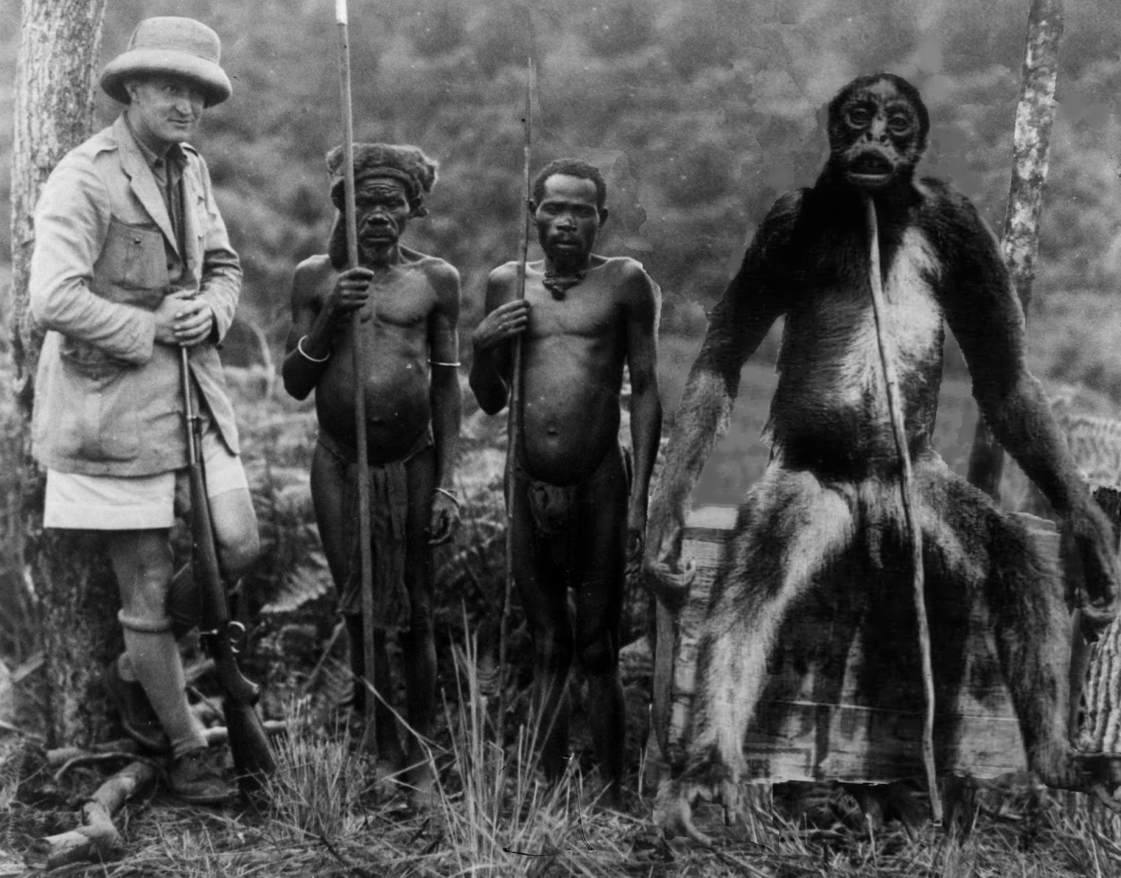 Might some early photograph such as this one, from 1912, depicting two native hunters holding upright a very large dead chimpanzee (now known to be one of the elusive