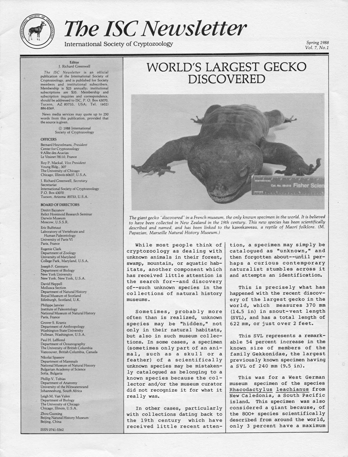 Discovery and description of H. delcourtias documented in the now-defunct International Society of Cryptozoology's spring 1988 ISC Newsletter (© ISC/reproduction courtesy of J. Richard Greenwell)True, two fossil items have been uncovered that were tentatively referred to H. delcourti by Bauer and Russell when they formally described and named this species in 1986, but Worthy is by no means convinced that such referrals were justified.