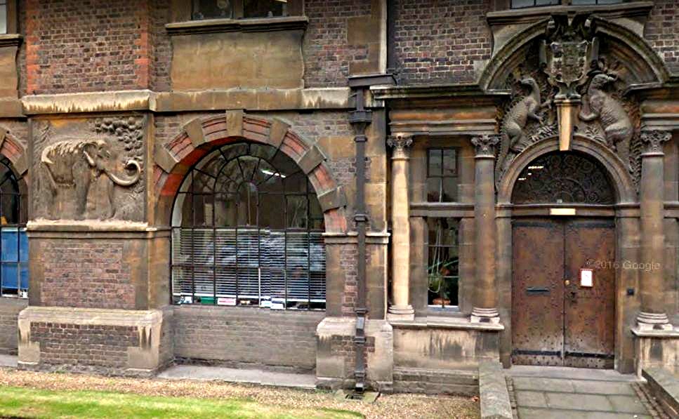 Side view of Sedgwick Museum of Earth Sciences showing woolly mammoth wall relief and entrance door bearing Iguanodon/Megatheriumarchway (© Google Earth Maps 2016 – reproduced here on a strictly educational, non-commercial Fair Use basis for review purposes only)And if anyone can tell me the name of the sculptor who produced the Iguanodon and Megatherium carvings (and presumably the woolly mammoth relief too), I'd be extremely grateful, because I have so far been unable to discover this – many thanks indeed!