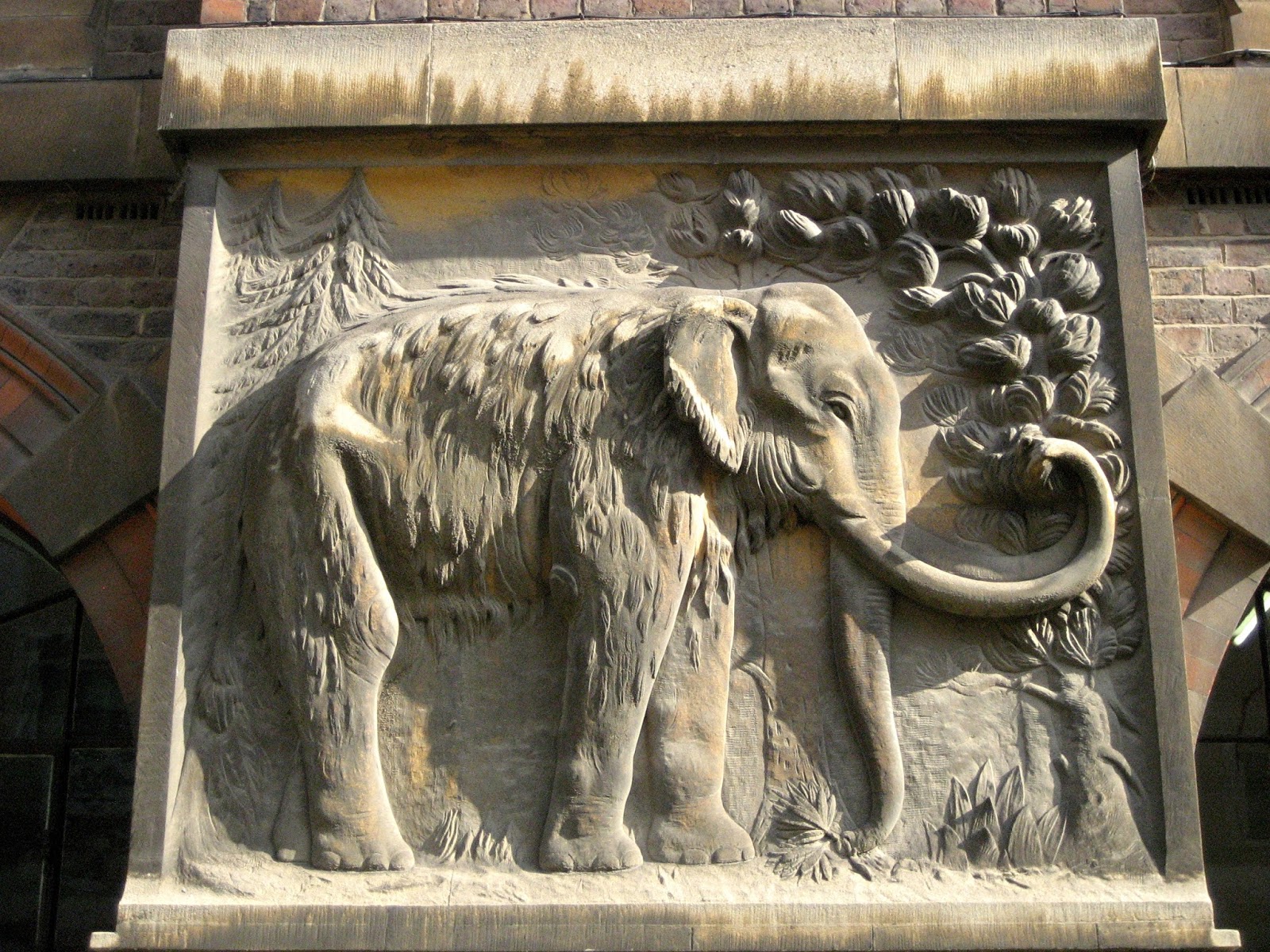 Woolly mammoth relief on the outer wall situated just to the left of the Iguanodon/Megatheriumarchway (© Vysotsky/Wikipedia –