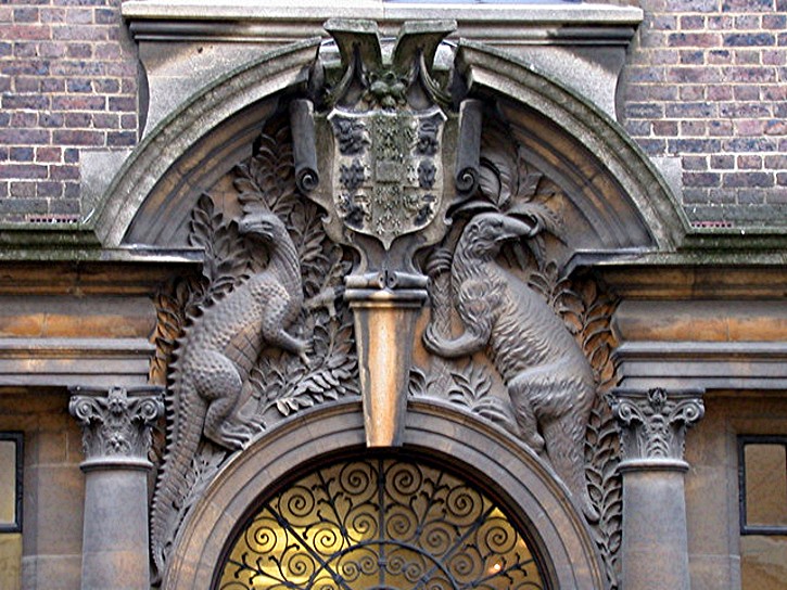 )The Megatherium and Iguanodon in question are a pair of large, ornamental carvings flanking (or supporting, to use the correct heraldic term) the university's coat of arms present above the archway of one of the entrances to the Sedgwick Museum of Earth Sciences. Also referred to as the Sedgwick Memorial Museum, it is based in Downing Street, Cambridge, and constitutes the oldest of this university's eight academic museums.