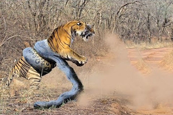 These include two other lion photos, two different tigers, two different jaguars, a black panther, cheetah, Alsatian dog, elephant, black-and-white cow, rabbit, and (inevitably) various versions featuring humans, as well as some mechanical items, such as a tractor and mechanical diggers or excavators, but all of them united by the presence of precisely the same anaconda coils and outstretched body.