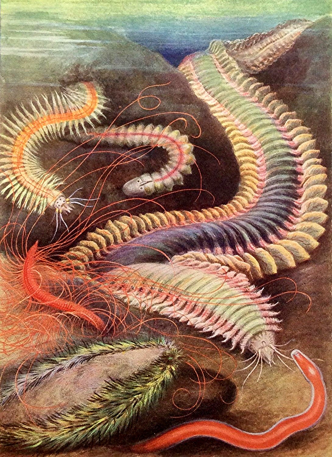 Beautiful colour illustration by okapi-discoverer Sir Harry Johnston depicting a selection of marine worms, including a sea mouse at the bottom-left corner, from Marvels of the Universe, Vol. 2 (1927) (public domain)