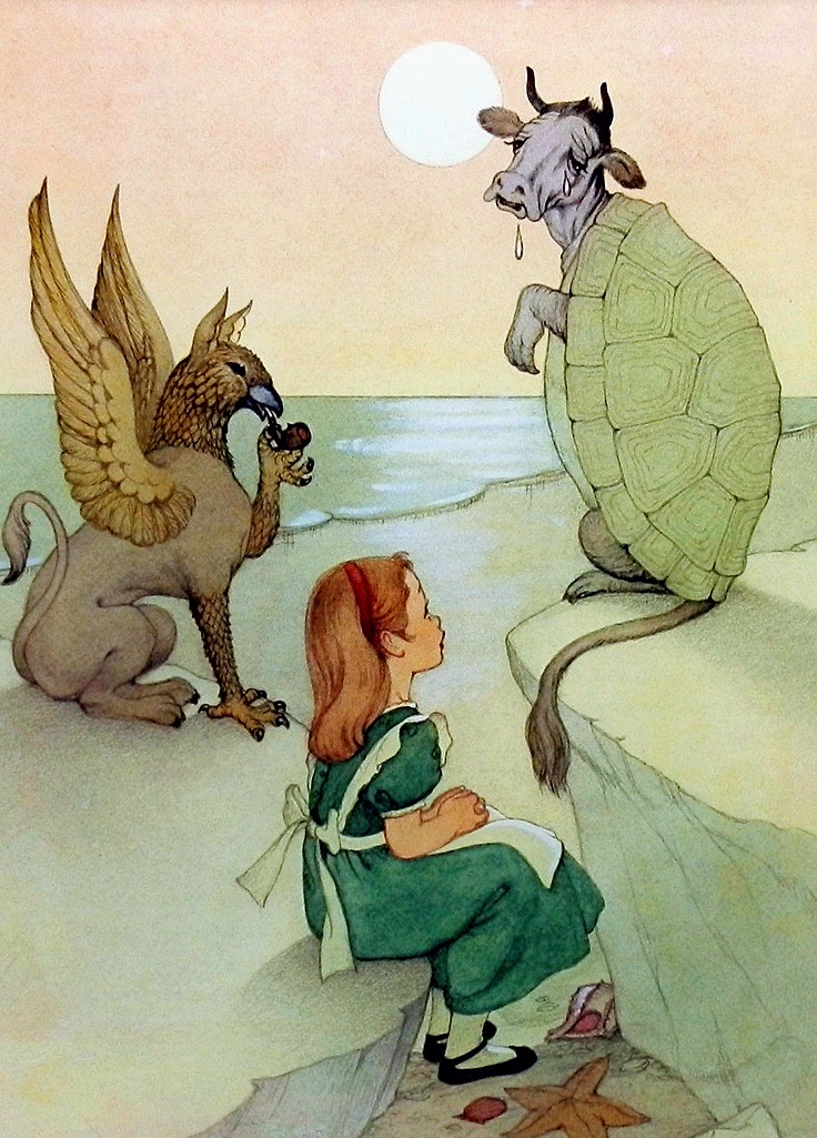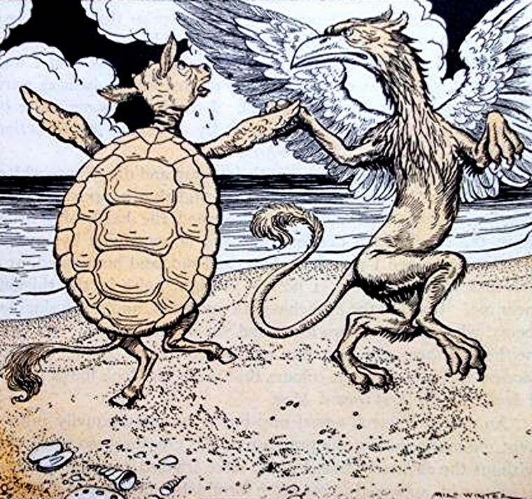 In this illustration from 1916, the Gryphon and a particularly tearful Mock Turtle perform the Lobster Quadrille for a somewhat bemused Alice (public domain)One further feature that was a major component of the Mock Turtle was its extremely lugubrious, sobbing demeanour. When Alice asked the Gryphon why his chelonian companion was so sorrowful, the Gryphon replied very dismissively that it was "all his fancy", that he didn't actually have any sorrow. Yet because the Mock Turtle briefly mentioned that he had once been a real turtle (but without providing any clues as to why he no longer was), there has been much speculation among Carrollian scholars as to whether this was the reason for his tearful melancholia, coupled perhaps with what may have been a poverty-stricken upbringing (when recounting his history to Alice, the Mock Turtle intimated that he was poor when young, revealing that he couldn't afford to study any extra subjects at school, only the regular ones).