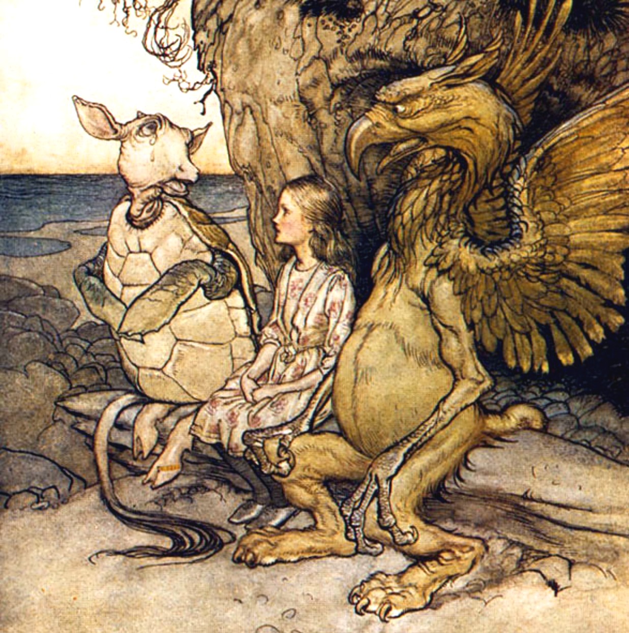 Classic illustration by Arthur Rackham of the Mock Turtle, Gryphon, and Alice, 1907 (public domain)Suddenly, all became clear. His fondness for humorous word games, puns, and other literary trickery had clearly inspired Carroll to dream up a character that was then playfully put forward by him when recounting his story as the (non-existent) creature from which was derived a certain very common veal-containing dish from his time whose memorable name would be familiar to his young listeners and thus make them laugh – namely, mock turtle soup. That was why the Mock Turtle had a turtle's shell and front flippers but a calf's head, hind limbs, and tail – with typically witty Carrollian absurdity, it was the visual embodiment of what mock turtle soup pretended to contain (turtle) and what it actually did contain (the calf elements listed above).