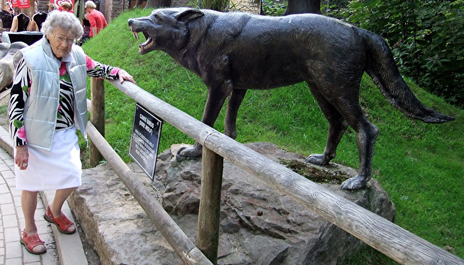My mother Mary Shuker alongside a very realistic replica of a dire wolf, at Dinosaur Valley, Wookey Hole, in Somerset, England, on 29 August 2010 (© Dr Karl Shuker)